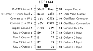 The EDE1144 Keypad Encoder IC is designed to interface a matrix-type 4 row x 4 column (16 key or less) keypad to a microcontroller or other host processor. A one-wire serial or four-wire parallel interface returns the keypress data and can be used in conjunction with a 'data valid' signal for polled or interrupt-driven applications. The EDE1144 provides enhanced keypad features such as contact debouncing and key auto-repeat in an easy-to-use package that will lower software overhead in the host microcontroller and reduce the I/O pin requirements from eight to one, frequently resulting in the use of a less costly host microcontroller in your design.